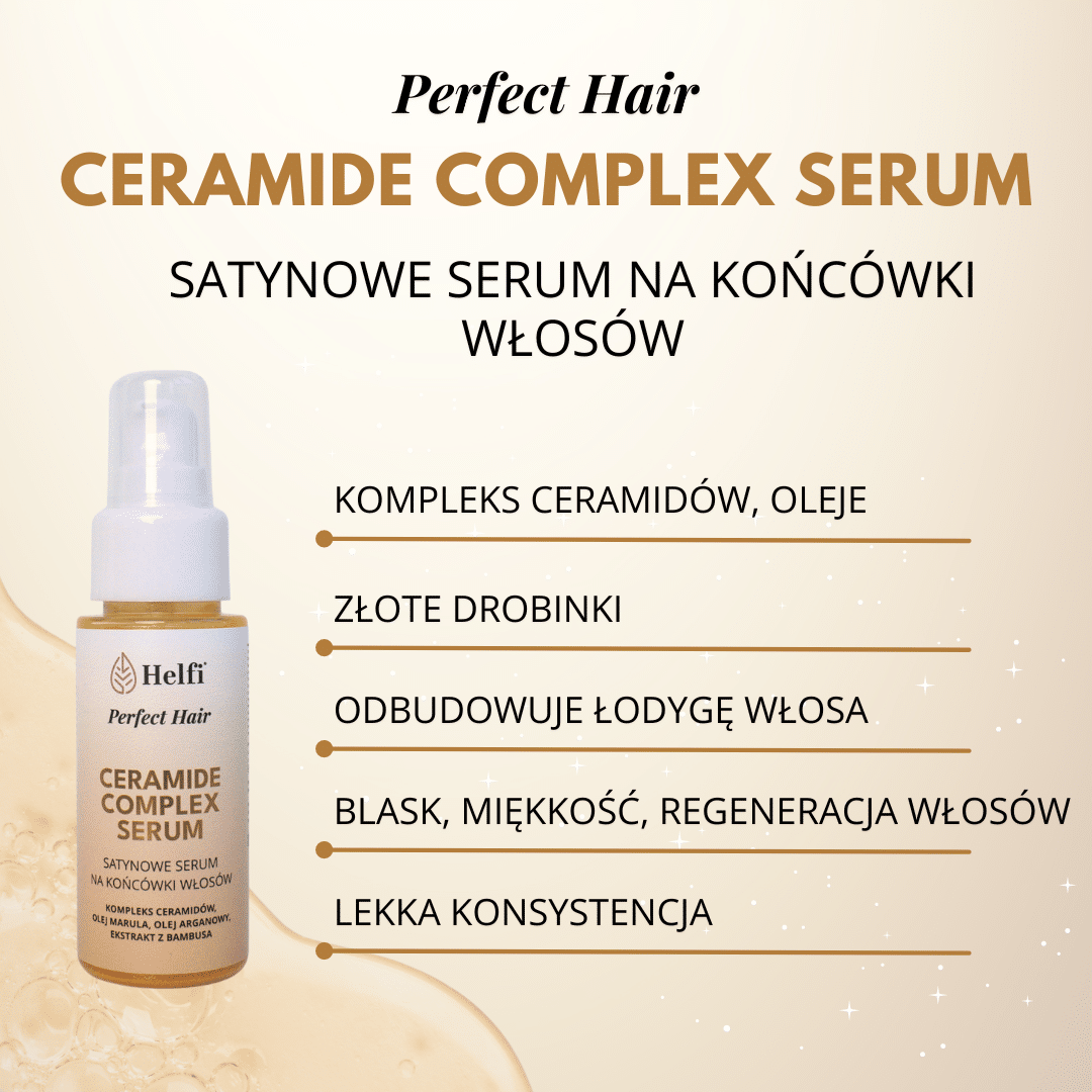 Ceramide Complex Serum z linii Perfect Hair to regenerujące i wygładzające serum silikonowe na końcówki włosów zapewniające holistyczną pielęgnację. Zawarty w składzie kompleks ceramidów doskonale odbudowuje i wypełnia uszkodzone miejsca w strukturze włosa. Dzięki wzbogaceniu o ekstrakt z bambusa, witaminę E oraz oleje, produkt łączy w sobie składniki o działaniu ochronnym i wzmacniającym. Serum perfekcyjnie poprawia kondycję i elastyczność włosów oraz zmniejsza ich łamliwość. Lekka konsystencja i zapach zapewniają wspaniałe doznania podczas aplikacji produktu. Włosy staną się gładkie, lśniące i intensywnie zregenerowane.
