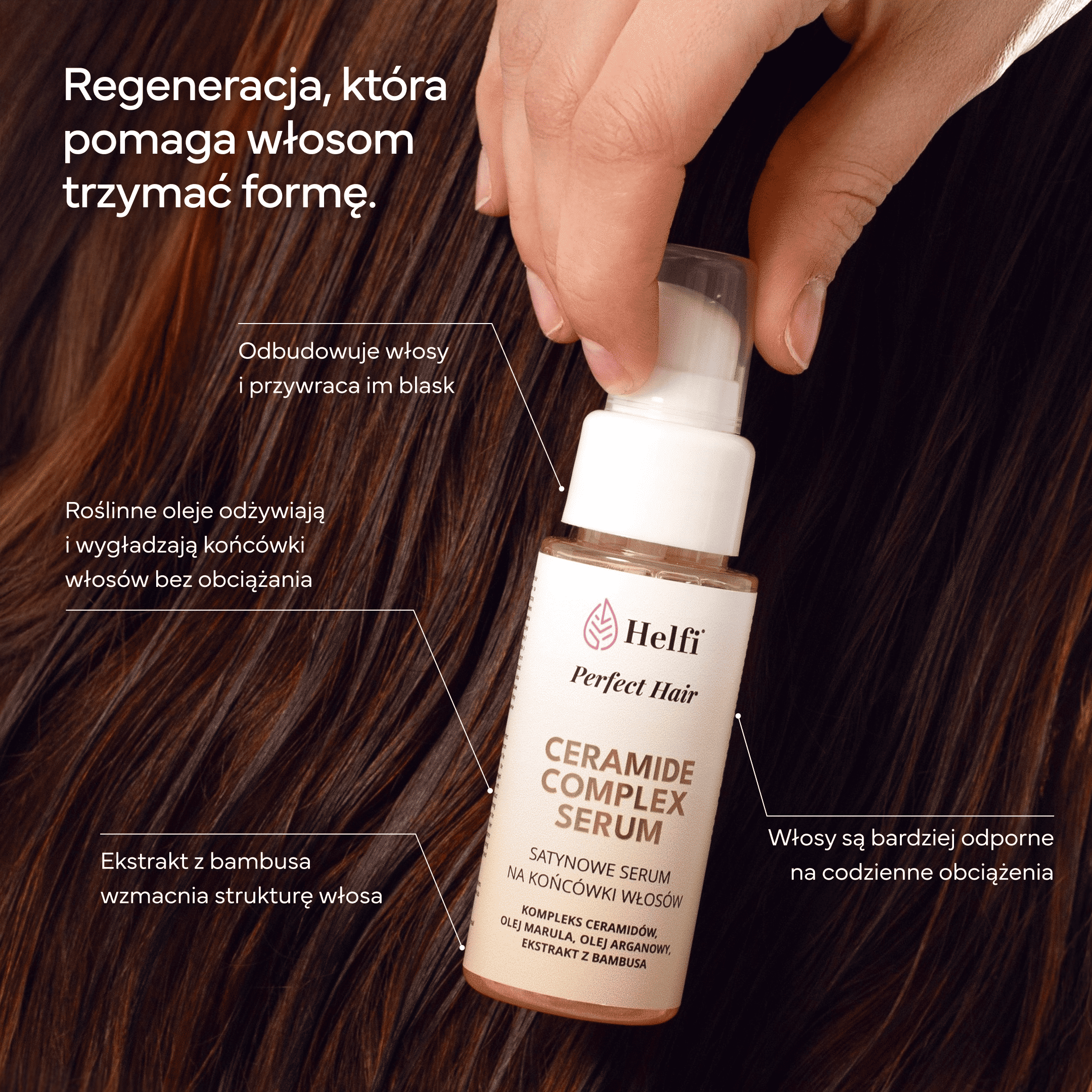 Nałóż niewielką ilość serum ceramidowego na wilgotne lub suche końcówki, aby je odbudować i wzmocnić.