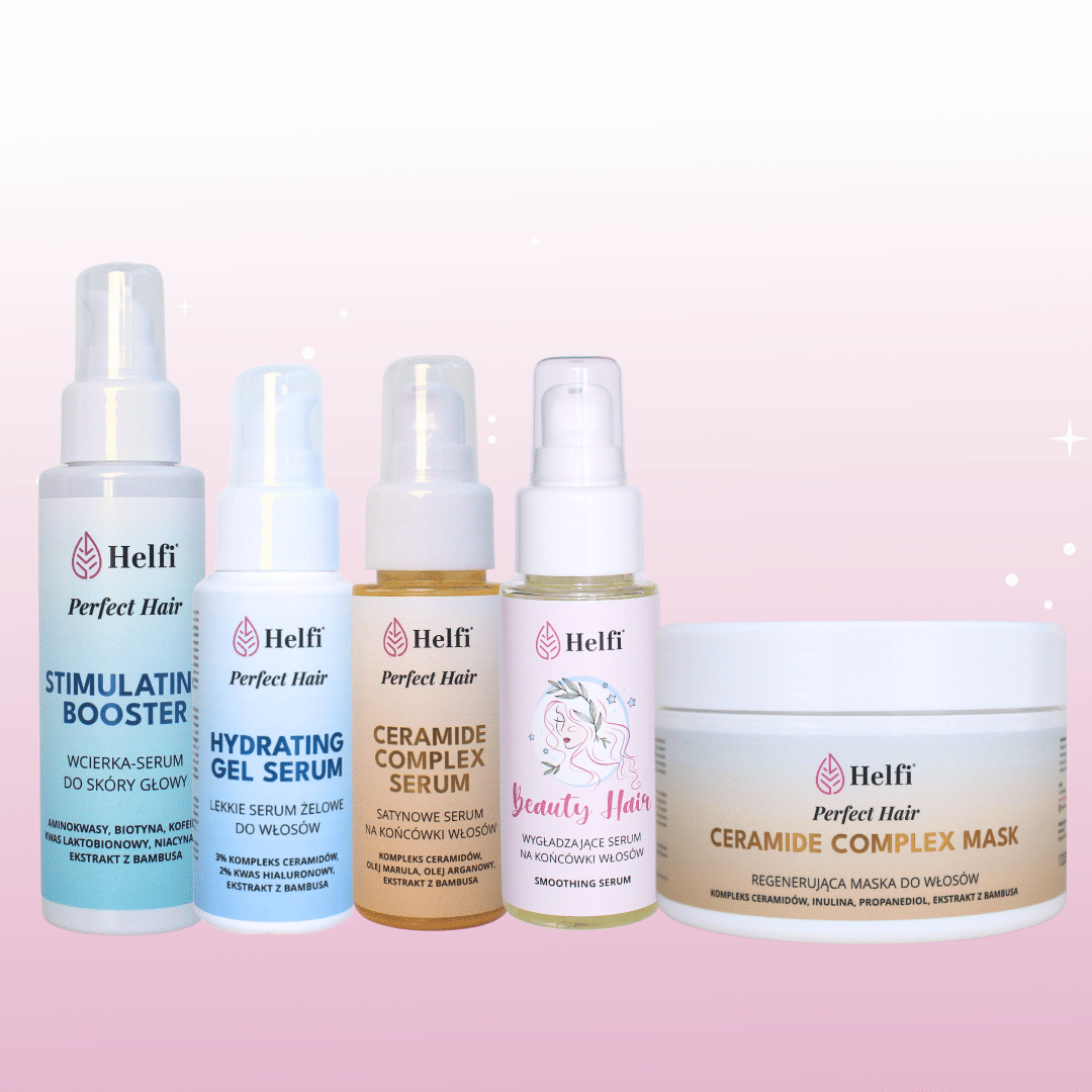 Linia kosmetyków Perfect Hair została stworzona z myślą o kompleksowej, a zarazem minimalistycznej pielęgnacji włosów. Te wyjątkowe produkty łączą w sobie najlepsze składniki aktywne, które zapewniają zdrowie, blask i siłę Twoim włosom. Dzięki starannie dobranym formułom, kosmetyki Perfect Hair dostarczają wszystko, czego potrzebują Twoje włosy i skóra głowy, eliminując zbędne kroki w codziennej rutynie pielęgnacyjnej. Odkryj sekret pięknych włosów z Helfi.